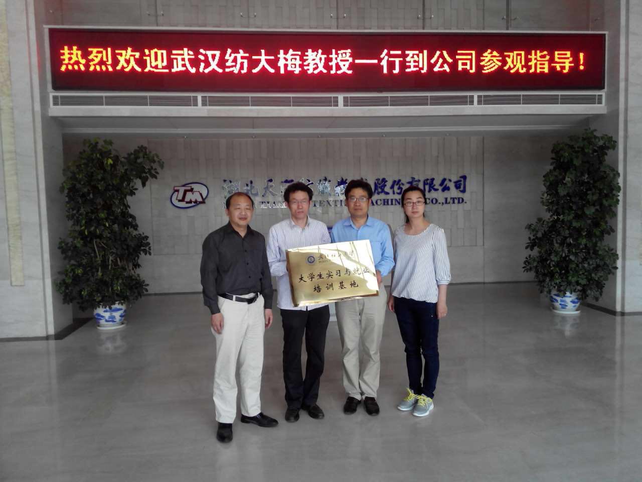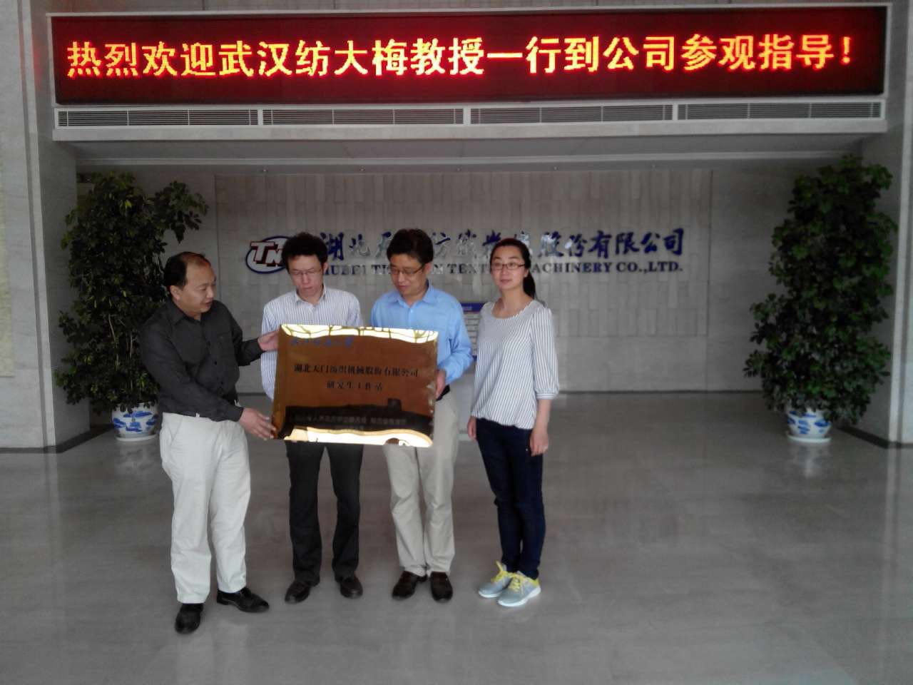 武漢紡織大學攜手天門紡機建立湖北省研究生工作站和大學生實習與就業基地(從左至右依次為院長梅順齊、執行院長燕怒、總工程師鄭強、辦公室主任李靜)