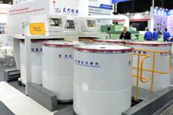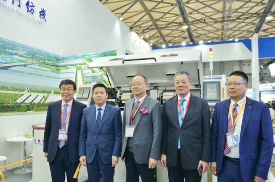 中國紡織機械協會會長顧平(右2)、福建新華源董事長陳宗立(左2)在天門紡機展位前合影