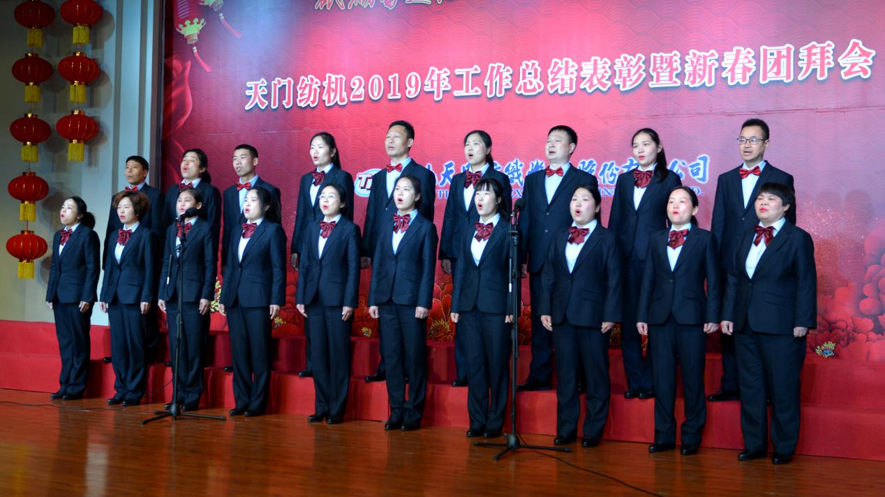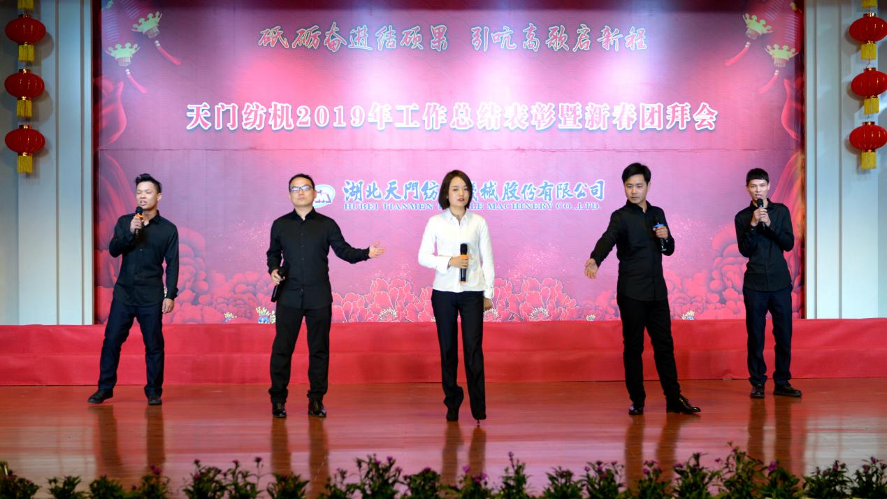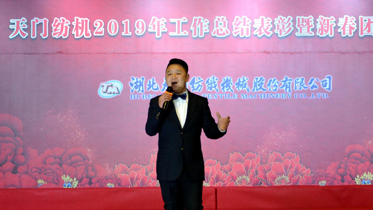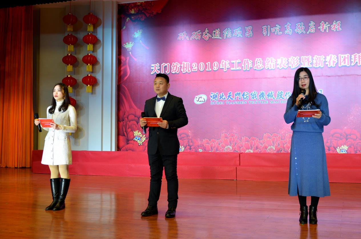 2020年1月21日下午,湖北天門紡織機械股份有限公司綜合樓多功能廳張燈結彩、暖流融融,一場主題為“砥礪奮進結碩果、引吭高歌啟新程”的年度總結表彰暨新春團拜會在這里舉行,400多名員工身著公司新佩發的西服套裝,精神奕奕地走進會場。13:00整,三位主持人靚妝登場,宣布2019年度總結表彰暨新春團拜會開始。