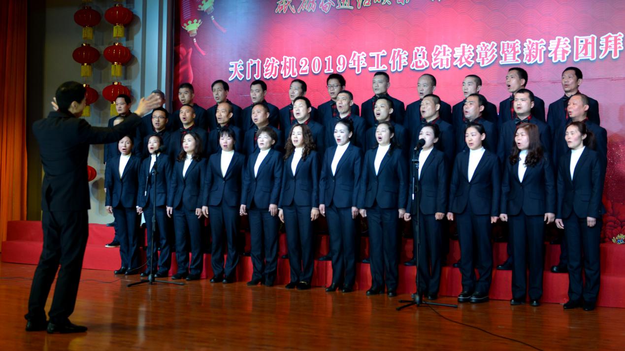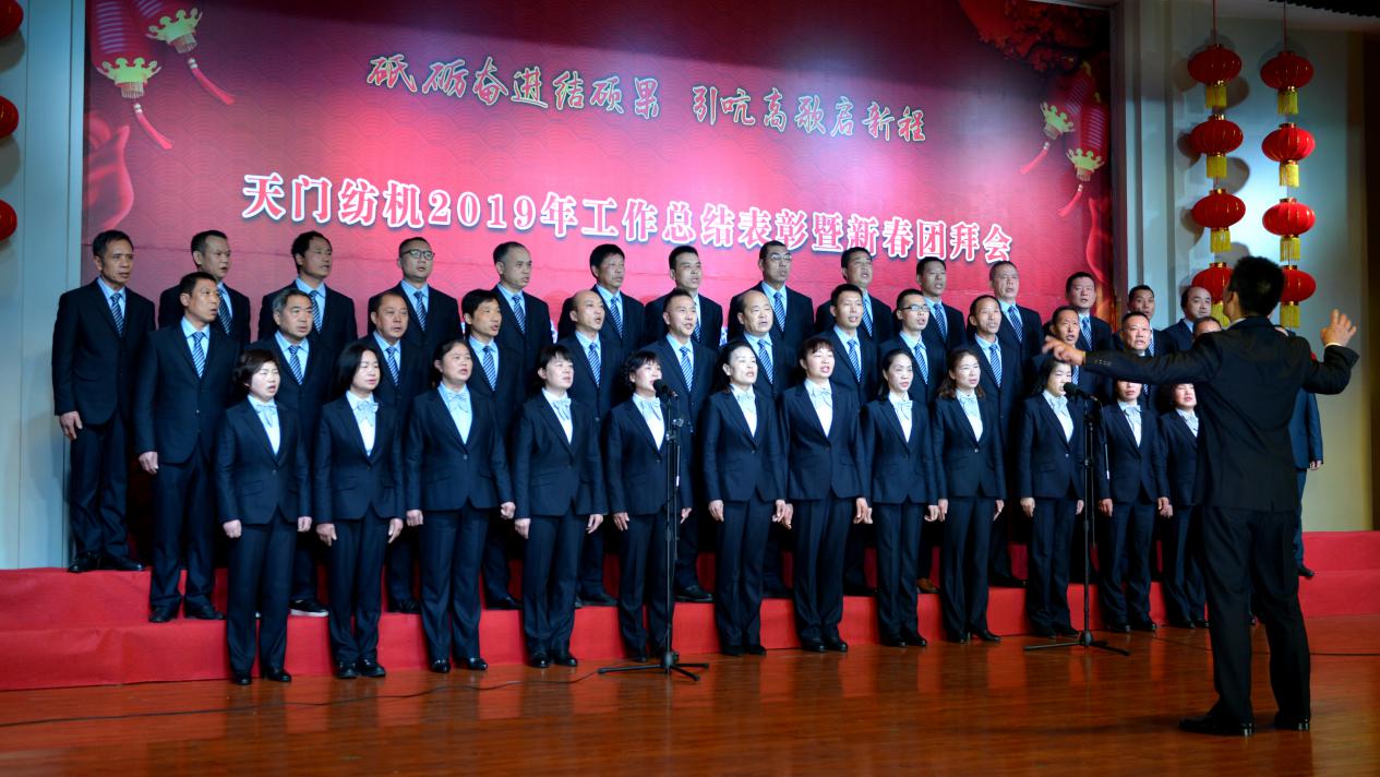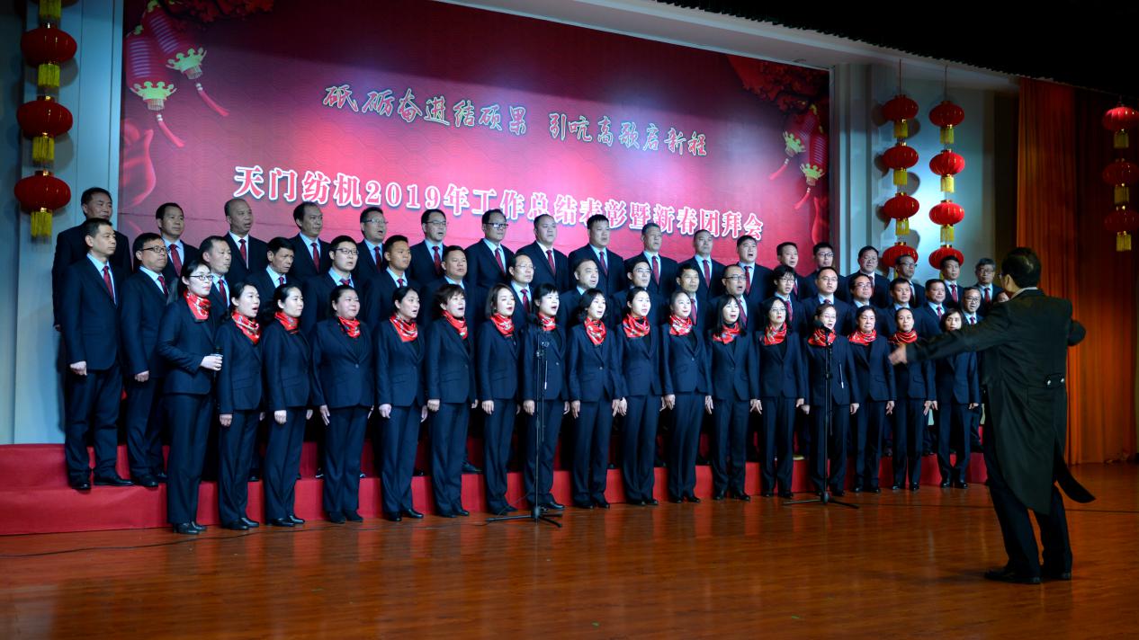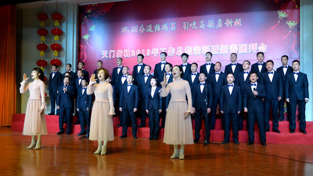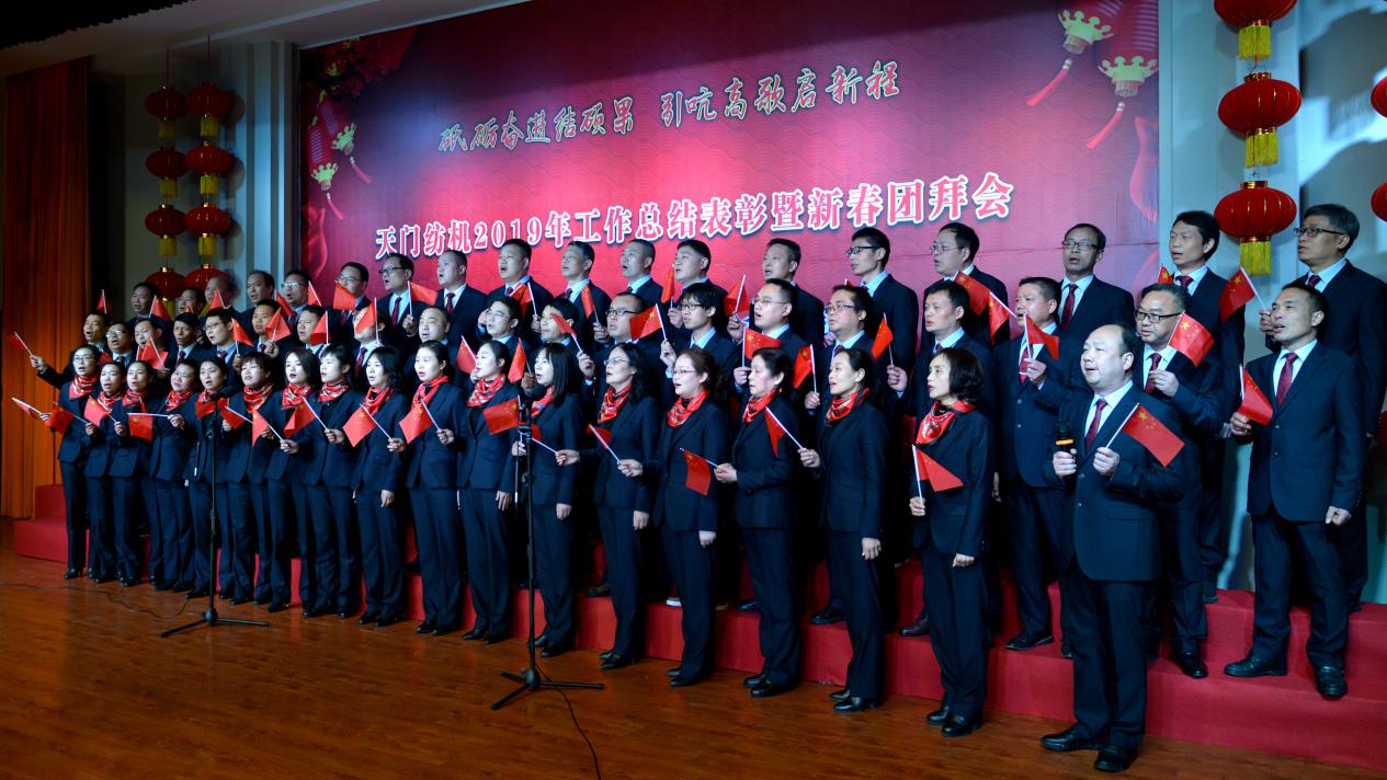 2020年1月21日下午,湖北天門紡織機械股份有限公司綜合樓多功能廳張燈結彩、暖流融融,一場主題為“砥礪奮進結碩果、引吭高歌啟新程”的年度總結表彰暨新春團拜會在這里舉行,400多名員工身著公司新佩發的西服套裝,精神奕奕地走進會場。13:00整,三位主持人靚妝登場,宣布2019年度總結表彰暨新春團拜會開始。