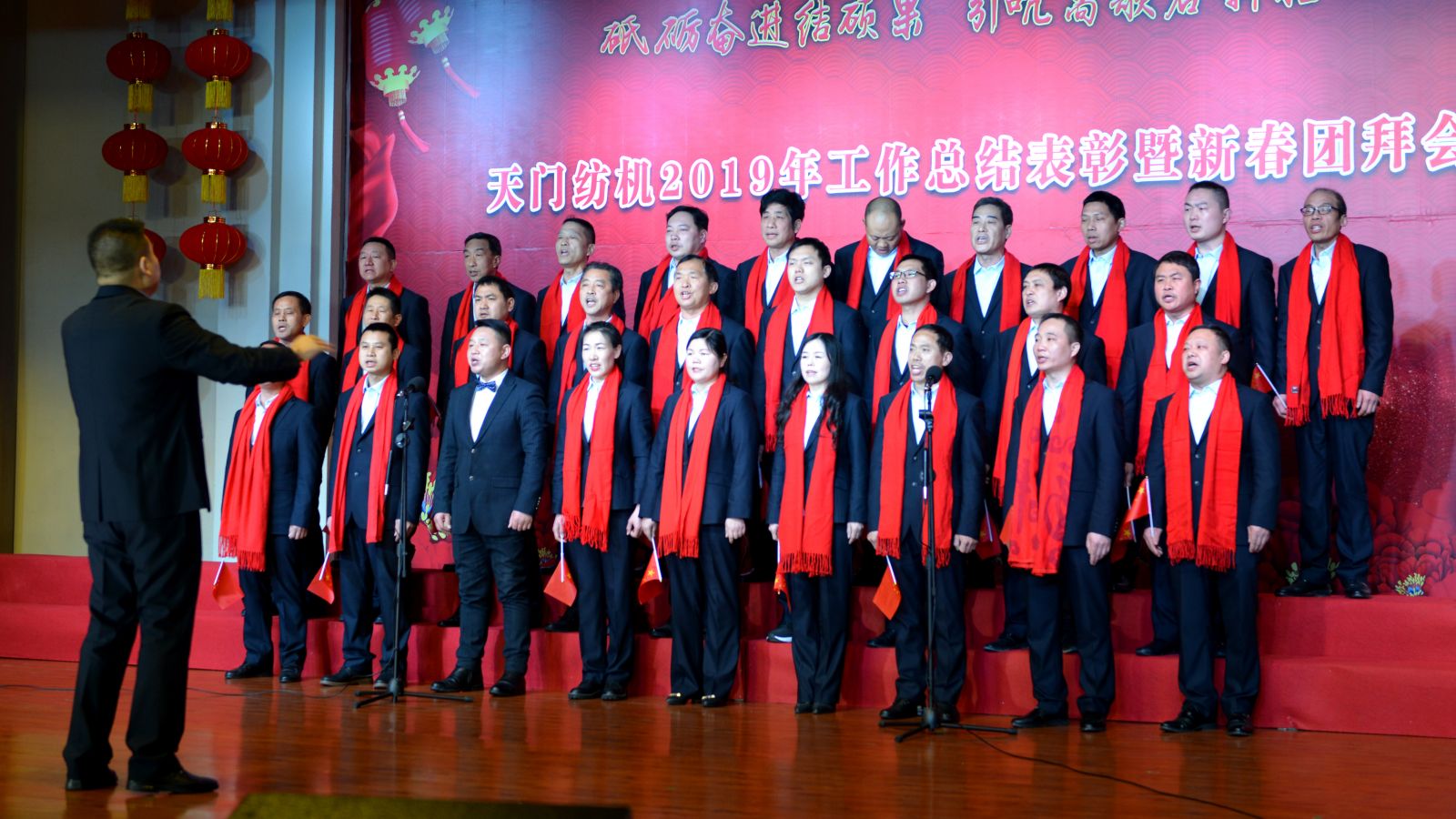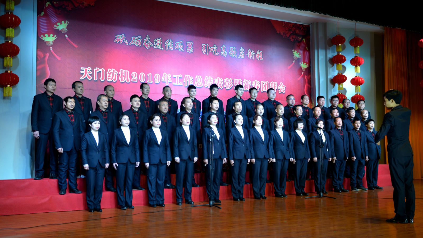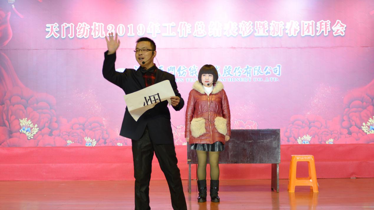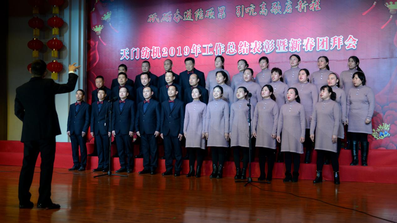 2020年1月21日下午,湖北天門紡織機械股份有限公司綜合樓多功能廳張燈結彩、暖流融融,一場主題為“砥礪奮進結碩果、引吭高歌啟新程”的年度總結表彰暨新春團拜會在這里舉行,400多名員工身著公司新佩發的西服套裝,精神奕奕地走進會場。13:00整,三位主持人靚妝登場,宣布2019年度總結表彰暨新春團拜會開始。