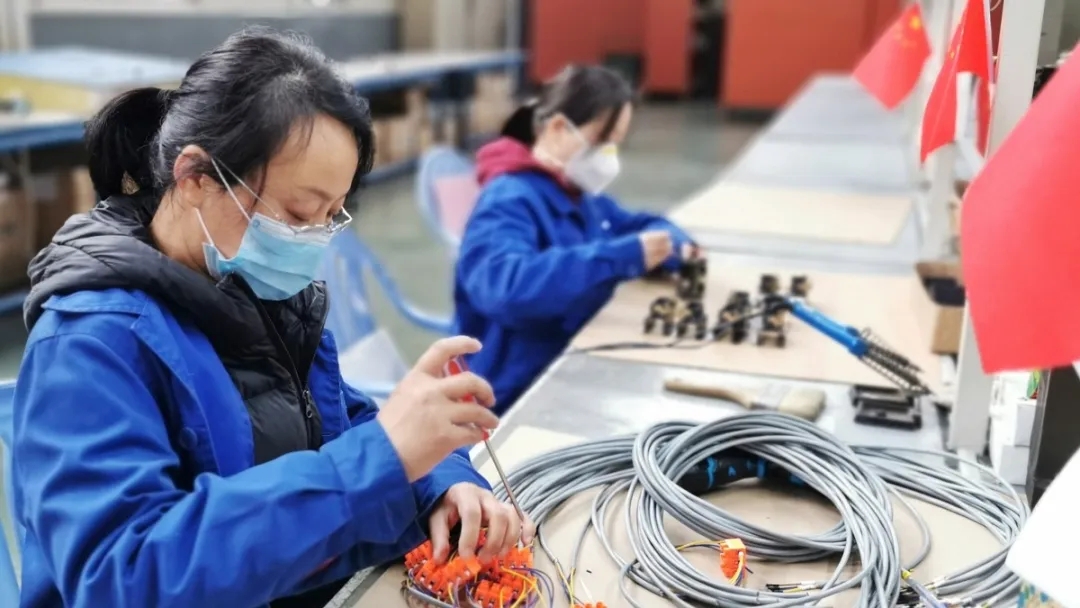 紡電員工李莉、徐艷華根據發貨型號機型進行電器零部件配套整理