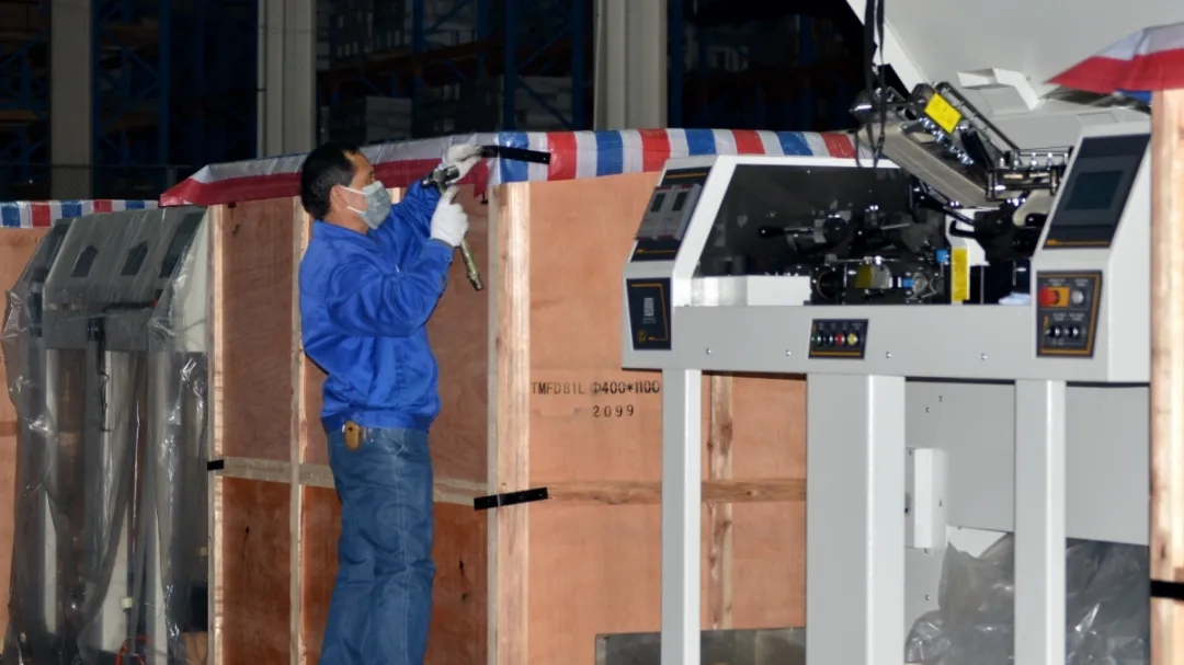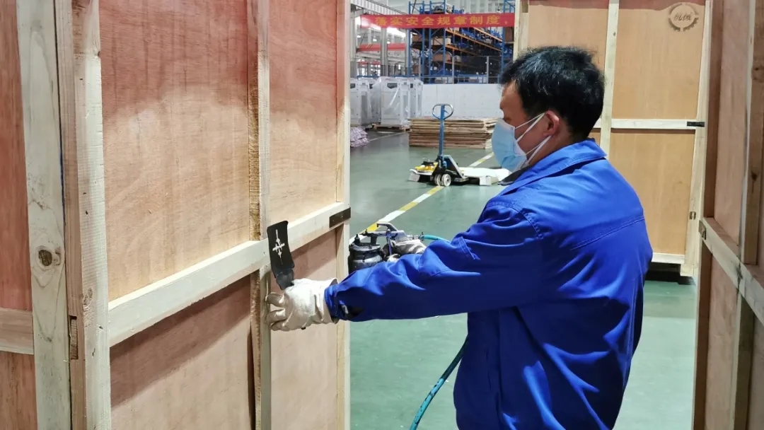 總裝車間主任彭文武對發貨產品包裝作邊角固定