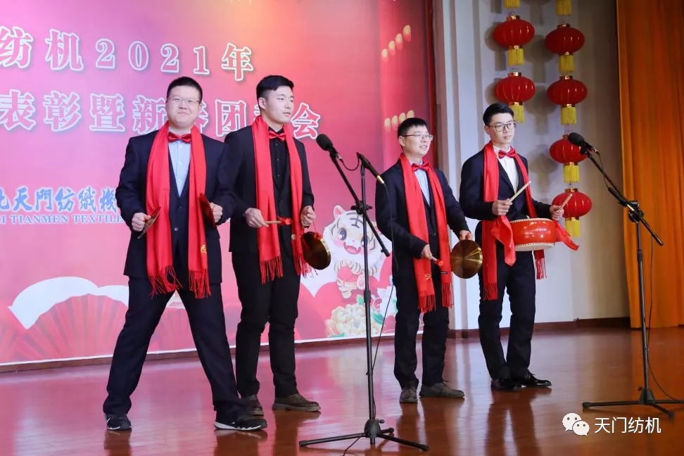打起三棒鼓,敢為天下先。加工車間表演的三句半——《天門紡機攢》,詼諧幽默,充滿了濃郁的鄉土氛圍,年味十足,喜慶熱鬧。