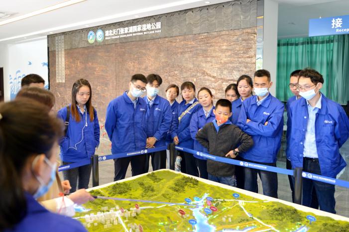 公司全體青年員工坐乘大巴車來到了張家湖國家濕地公園,它位于湖北省天門市九真鎮,湖泊水域面積6.53平方公里,平均水深1.8米,是典型的淺水湖泊,其濕地類型屬內陸淡水湖泊,是天門市最大的湖泊,也是湖北省保持原始生態最好的湖泊之一。到上世紀二十年代,隨著湖區淤積、湖泊萎縮,西部形成張家湖,東部形成石家湖。到達目的地后,公園的工作人員進行了熱情地接待,大家仿佛穿越到了原生態的農耕時代,湖泊密布,半島羅列,河湖相通,一派水鄉澤國、湖光田園景象。來到觀鳥臺,登高望遠,一覽張家湖美景和各種野生鳥類。公園設有科普館,里面陳列了濕地的人文風貌及天門的特色文化,還有各種攝影大片。