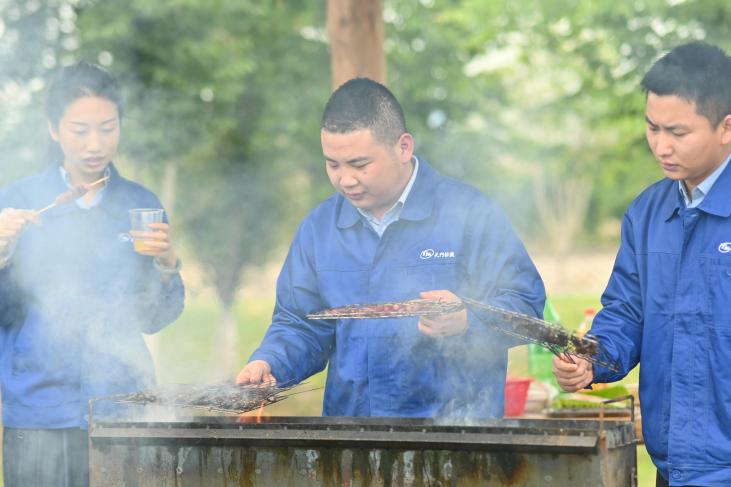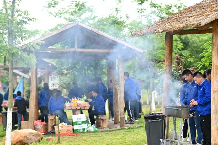 帶著依依不舍的心情,青年員工們告別張家湖國家濕地公園,來到皂市長壽村原村。這是一座位于皂市鎮境內的農家樂,田園氣息濃烈,采摘和燒烤樂趣無窮,大家直奔燒烤專區。幾名青年員工已提前將炊具、餐具和食材運送到目的地,大家不顧疲憊,開始分配工作,我是“支賓先生”,你是“炊事員”,她是“勤雜員”。一會兒后,炊煙升起,香氣四溢,有燒烤和火鍋的香辣味,有菠蘿的香甜味,有主食的香糯味,更有青年朋友們團結協作的歡聲笑語。