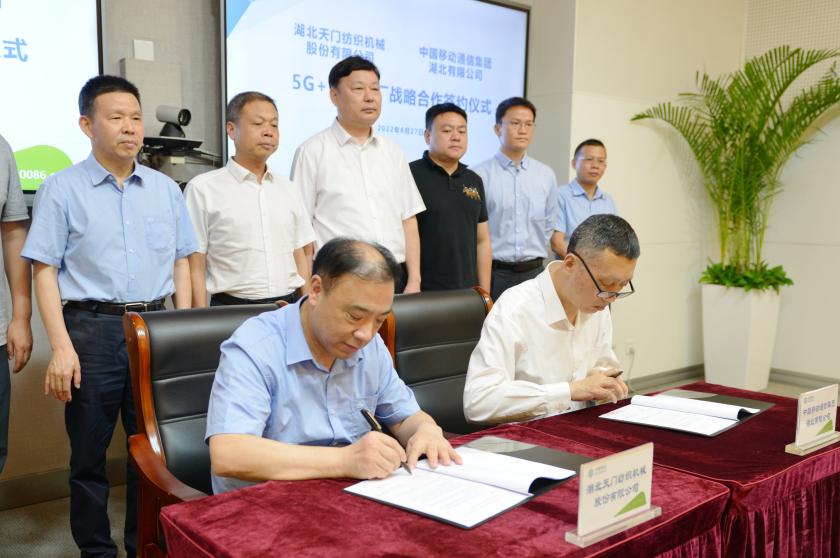 天門市委常委副市長曾令慧、經信局副局長宋鵬等領導出席了簽約式,全國人大代表天門紡機董事長沈方勇、全國人大代表湖北移動黨委書記董事長范秉衡分別致辭,天門紡機總經理焦倫進、湖北移動副總經理劉焱宇簽署了“5G+智慧工廠”戰略合作框架協議書。