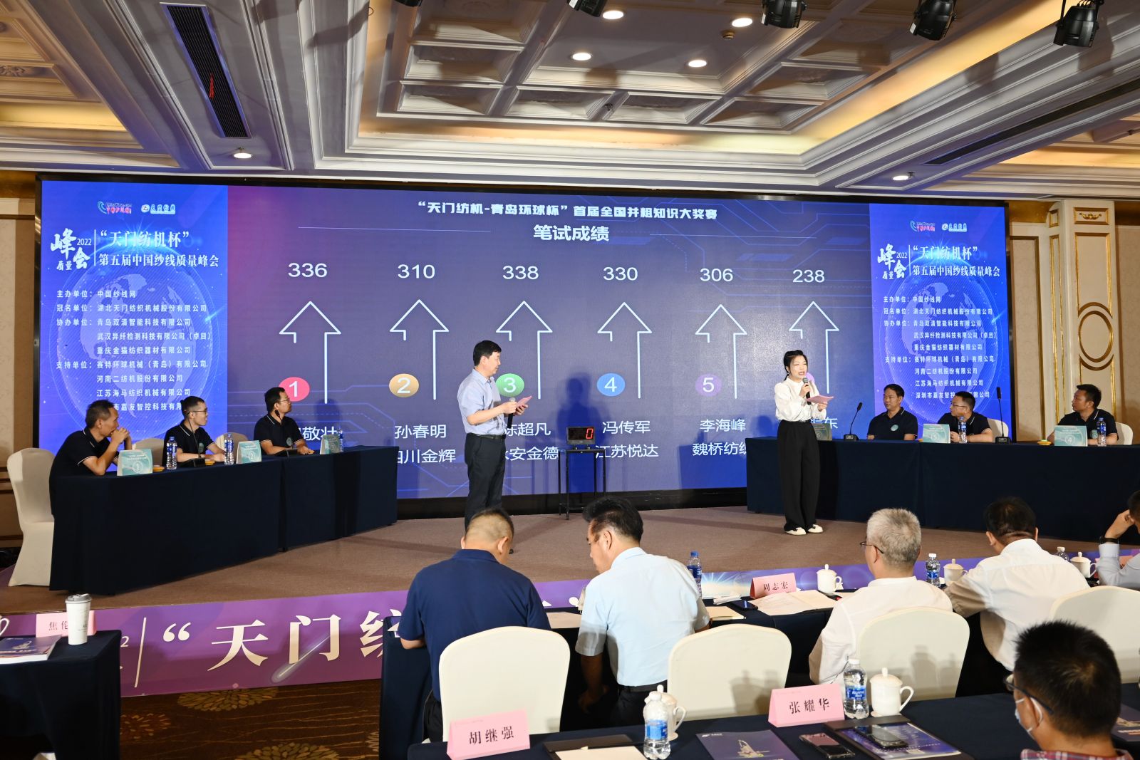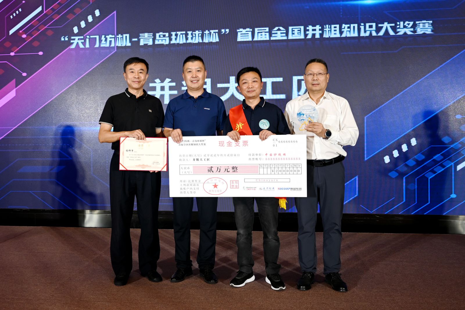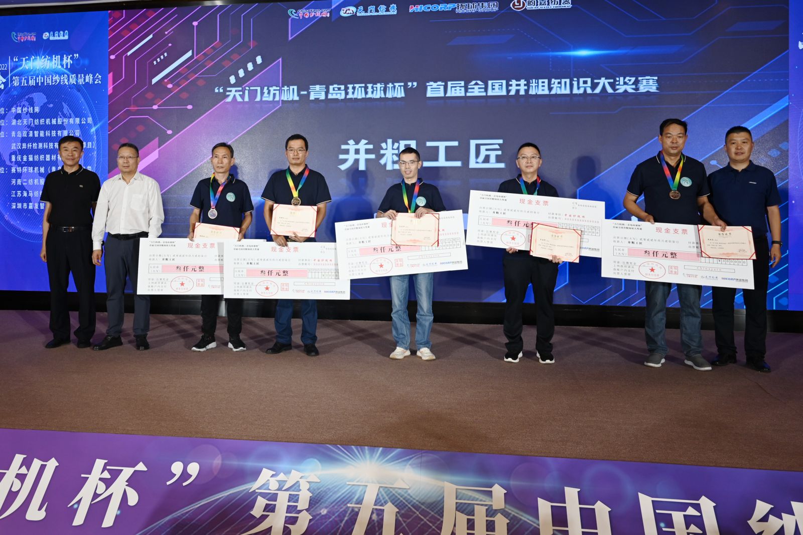 這是一場別開生面的競賽學習活動,6位選手的精彩表現(xiàn)不斷地贏得熱烈的掌聲,江蘇悅達馮傳軍以888分獲得“天門紡機-青島環(huán)球杯”首屆全國并粗知識大獎賽-爭霸賽冠軍,為歷時3個月的大賽活動劃上圓滿的句號。現(xiàn)場爭霸賽結(jié)束后,隆重舉行了頒獎活動,現(xiàn)場頒發(fā)“企業(yè)優(yōu)秀組織獎”、“并粗工匠獎”、“并粗大工匠獎”。天門紡機副總經(jīng)理肖少華、賽特環(huán)球營銷總監(jiān)陳濤、中國紗線網(wǎng)總裁鞠彥軍為大賽活動致辭并頒獎。